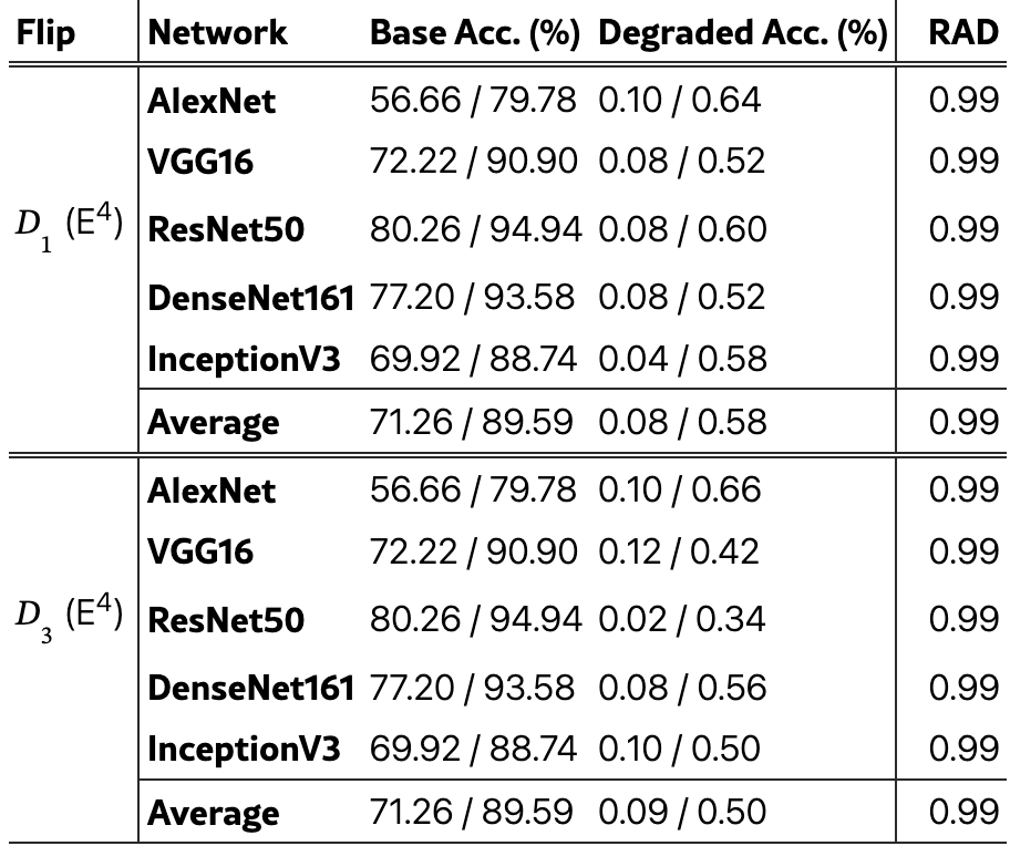 而且,在受到攻击后模型的准确率就会从 80%(BaseAcc)直接暴跌至 0.1%(DegradedAcc.)。